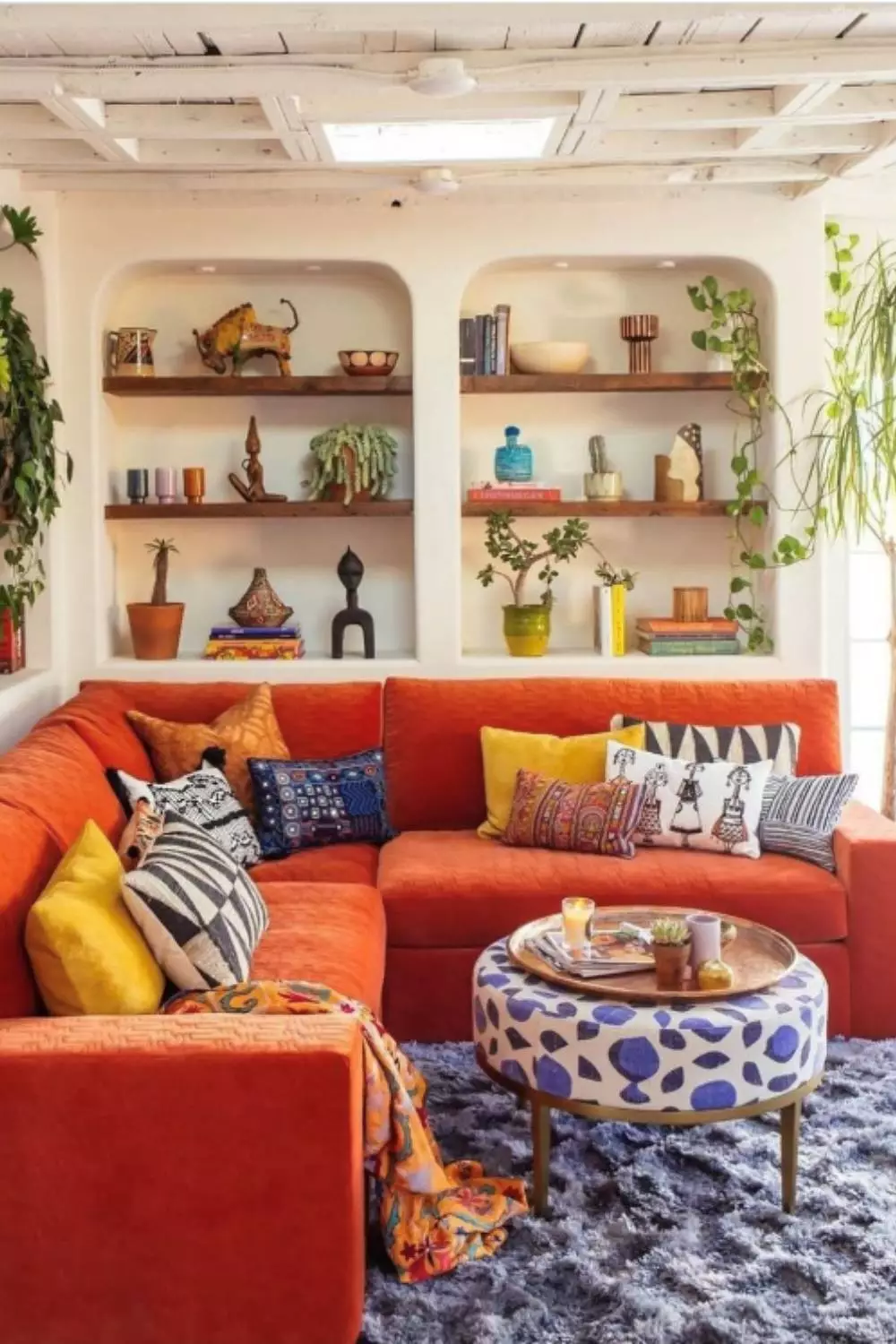 This striking orange couch commands attention while seamlessly blending into a thoughtfully designed space. Crisp white walls and arched alcoves create a harmonious and inviting backdrop, allowing the bold hue to shine without overwhelming the room. The raw white ceiling adds an element of effortless charm, embracing an “unfinished yet perfect” aesthetic. A mix of throw pillows—ranging from geometric to bohemian patterns—infuses texture and personality, while a patterned ottoman and touches of greenery enhance the warmth. Carefully curated decor within the alcoves introduces contrast, resulting in a dynamic fusion of design styles that feels both eclectic and intentional.
