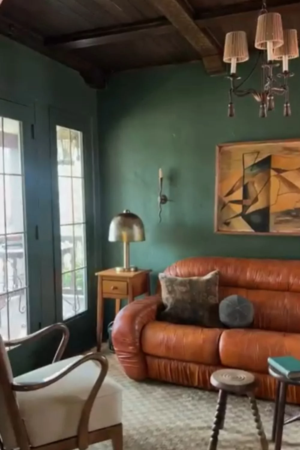This rich leather orange sofa exudes sophistication, with its curvy armrests and plush creases adding a touch of vintage charm. Set against deep MSU green walls, the contrast is bold yet luxurious, creating a space that feels both grounded and elegant. The sleek, uniquely curved accent chair echoes the sofa’s fluid design, while a sculptural table lamp enhances the room’s artistic appeal. Every detail—from the textured upholstery to the interplay of curves—adds depth, making this a perfect blend of classic refinement and contemporary edge.