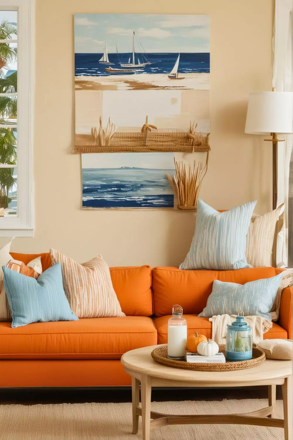 This orange sofa brings warmth to a coastal-inspired space, where soft beige walls feature stunning sea-themed wall art. Throw pillows in oceanic blues and seafoam hues echo the marine vibe, while a white lamp and sheer curtains allow the light to flow in, creating a breezy, tranquil atmosphere.