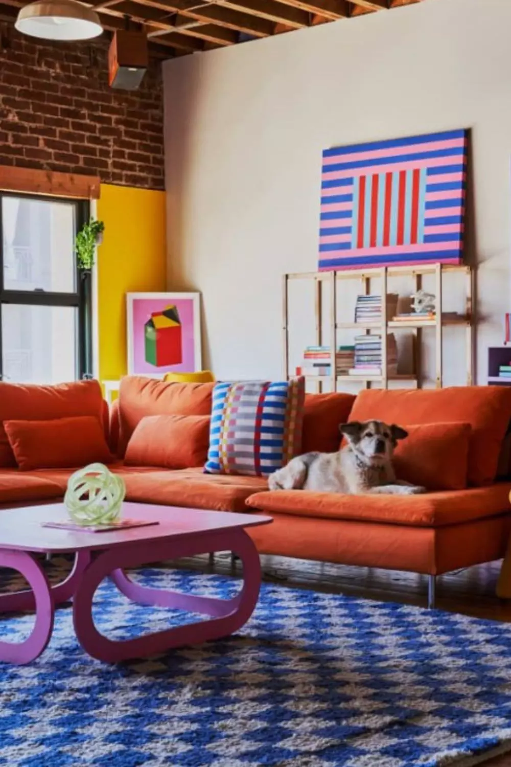 This living room is a fearless celebration of colour! A bold orange sofa pairs effortlessly with eye-catching wall art and a playful purple coffee table, creating a dynamic, modern aesthetic. The checkered blue rug adds a grounding touch, while bursts of pink and yellow keep the space fresh and inviting. A perfect mix of fun and sophistication!