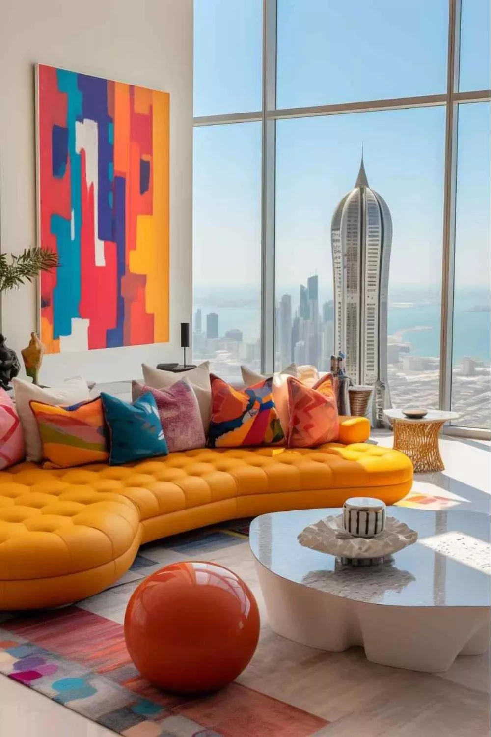 High above the city, this luxurious apartment boasts a vibrant orange sofa that anchors the space. Floor-to-ceiling glass walls reveal breathtaking views, while abstract modern art introduces splashes of color that complement the sofa without overpowering it. The blend of vertical and horizontal design elements creates a sense of harmony, making this urban retreat feel effortlessly chic.
